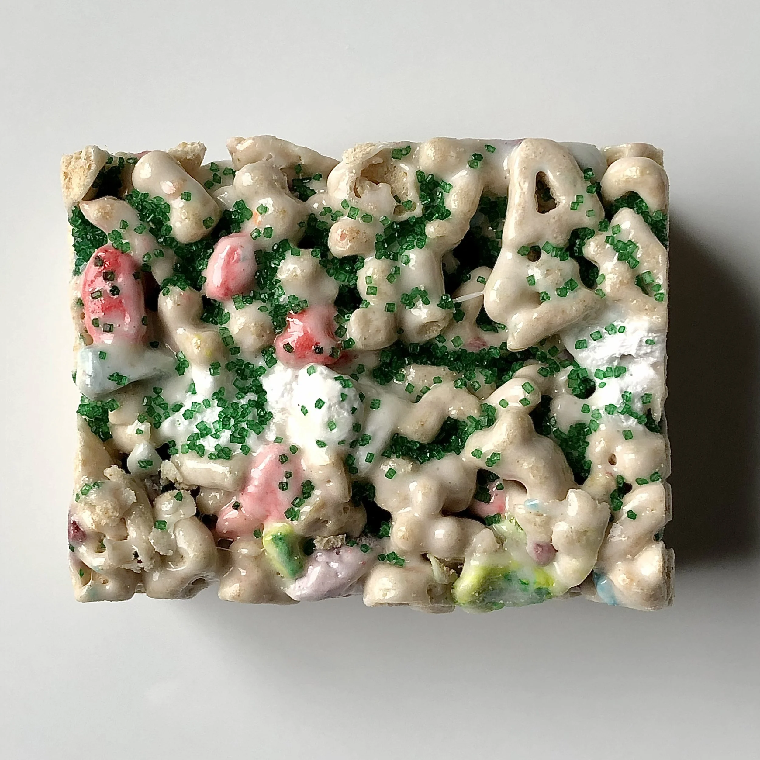 Lucky Charms® cereal crispie treat base, extra cereal marshmallows, extra marshmallows, topped with green sprinkles