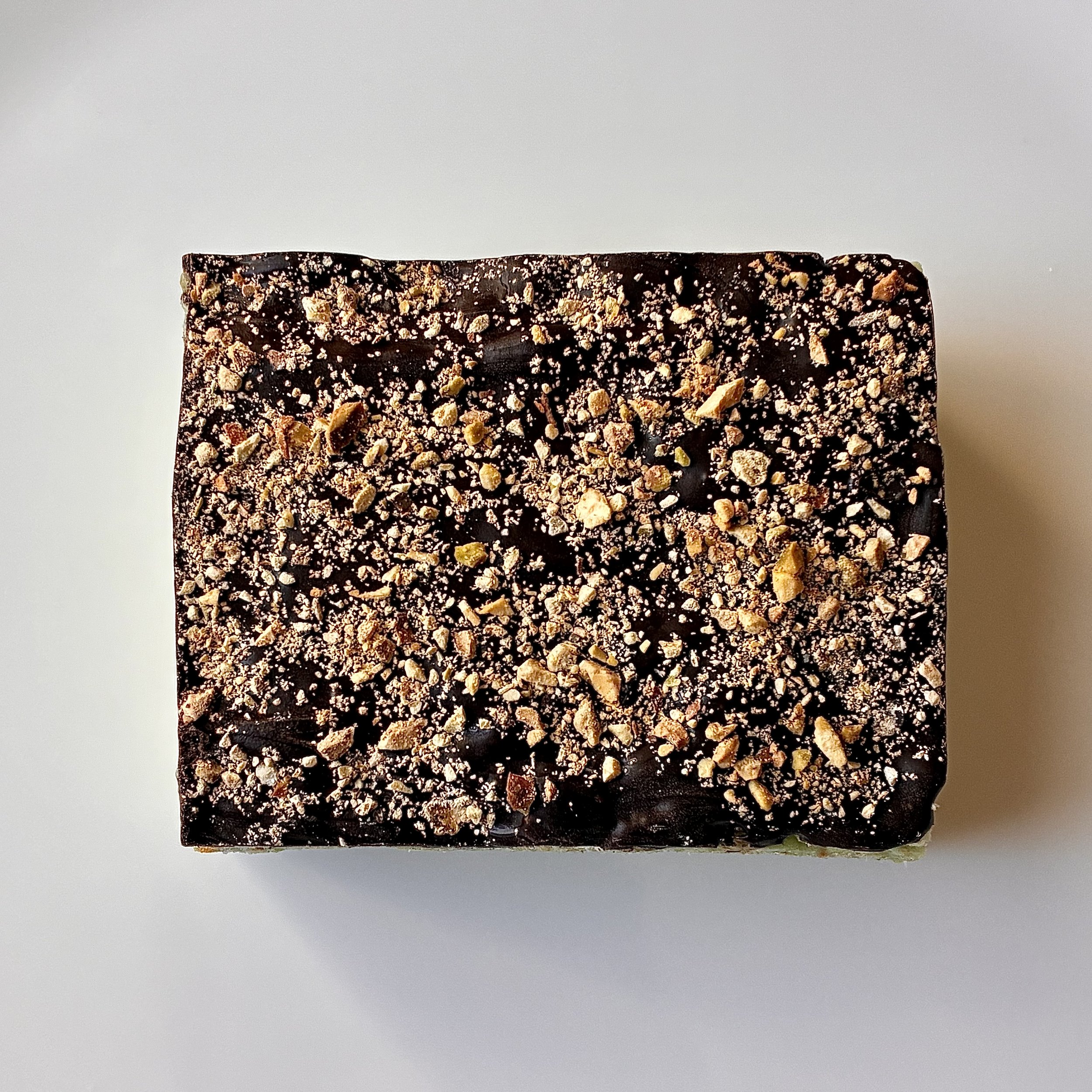 Chio Pistachio Cream rice crispie treat base, roasted shredded kataifi threads, tahini, extra marshmallows, topped with dark chocolate and crushed pistachios