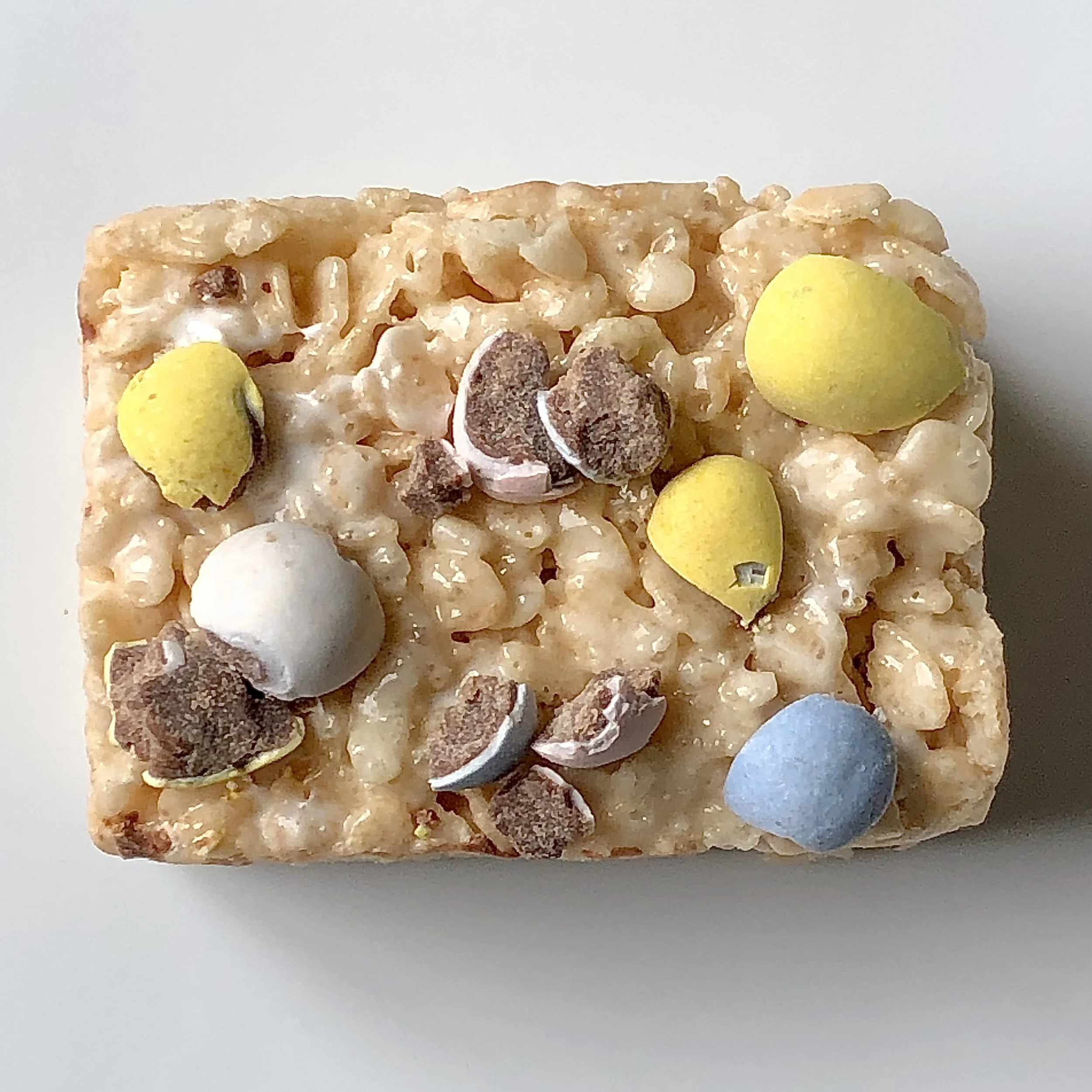 pure vanilla flavored rice crispie treat base, chopped Cadbury® mini eggs, extra marshmallows, topped with more chopped mini eggs