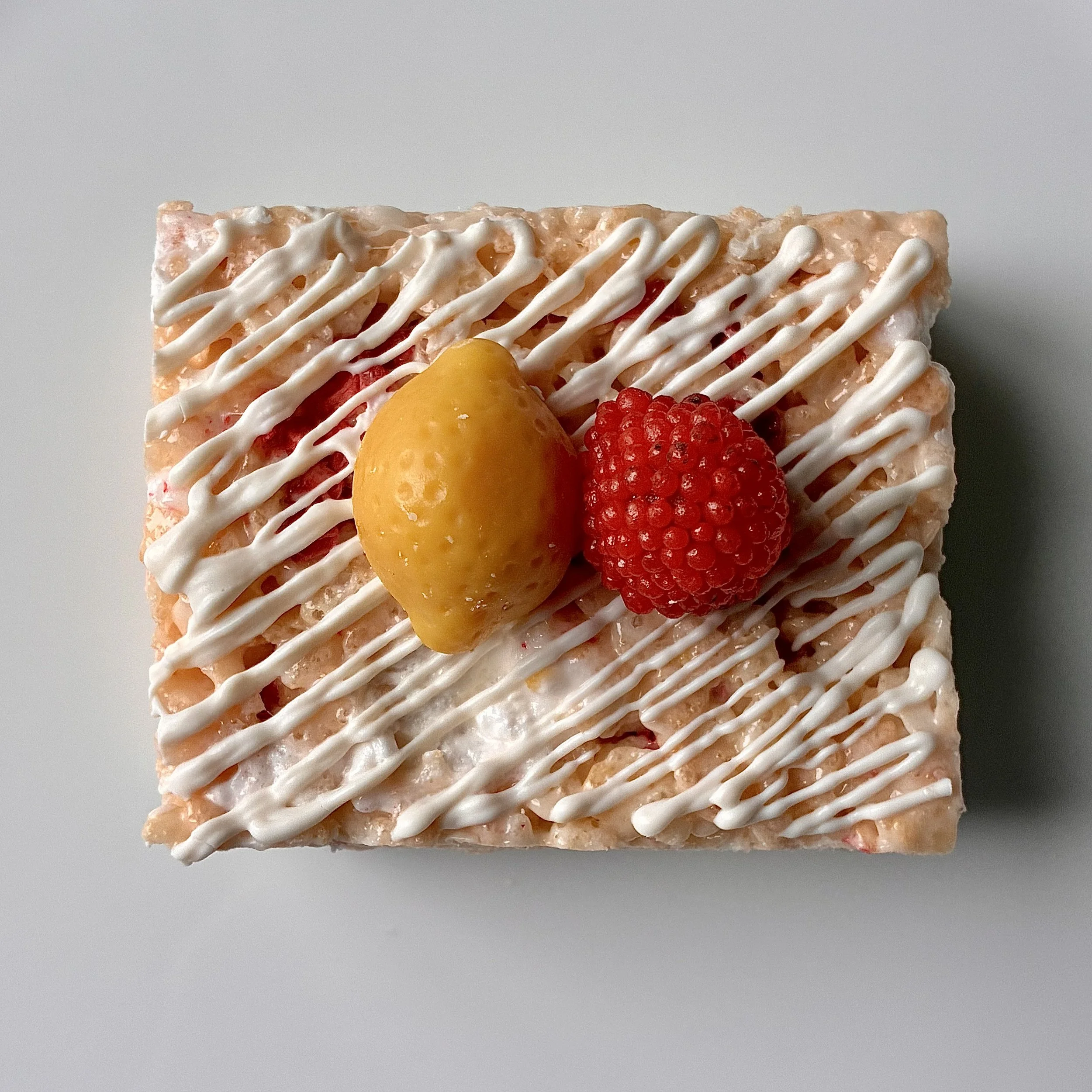 lemon flavored rice crispie treat base, freeze dried raspberry pieces, extra marshmallows, topped with a white chocolate drizzle, a lemon gummi candy and a raspberry gummi candy