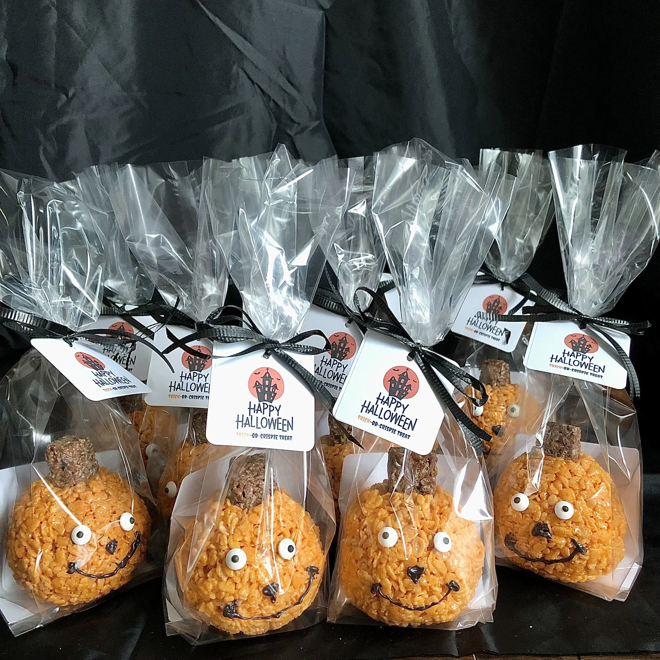 select from two options: pumpkin spice rice crispie treat pumpkin with a chocolate stem or vanilla classic rice crispie treat pumpkin with a chocolate stem
