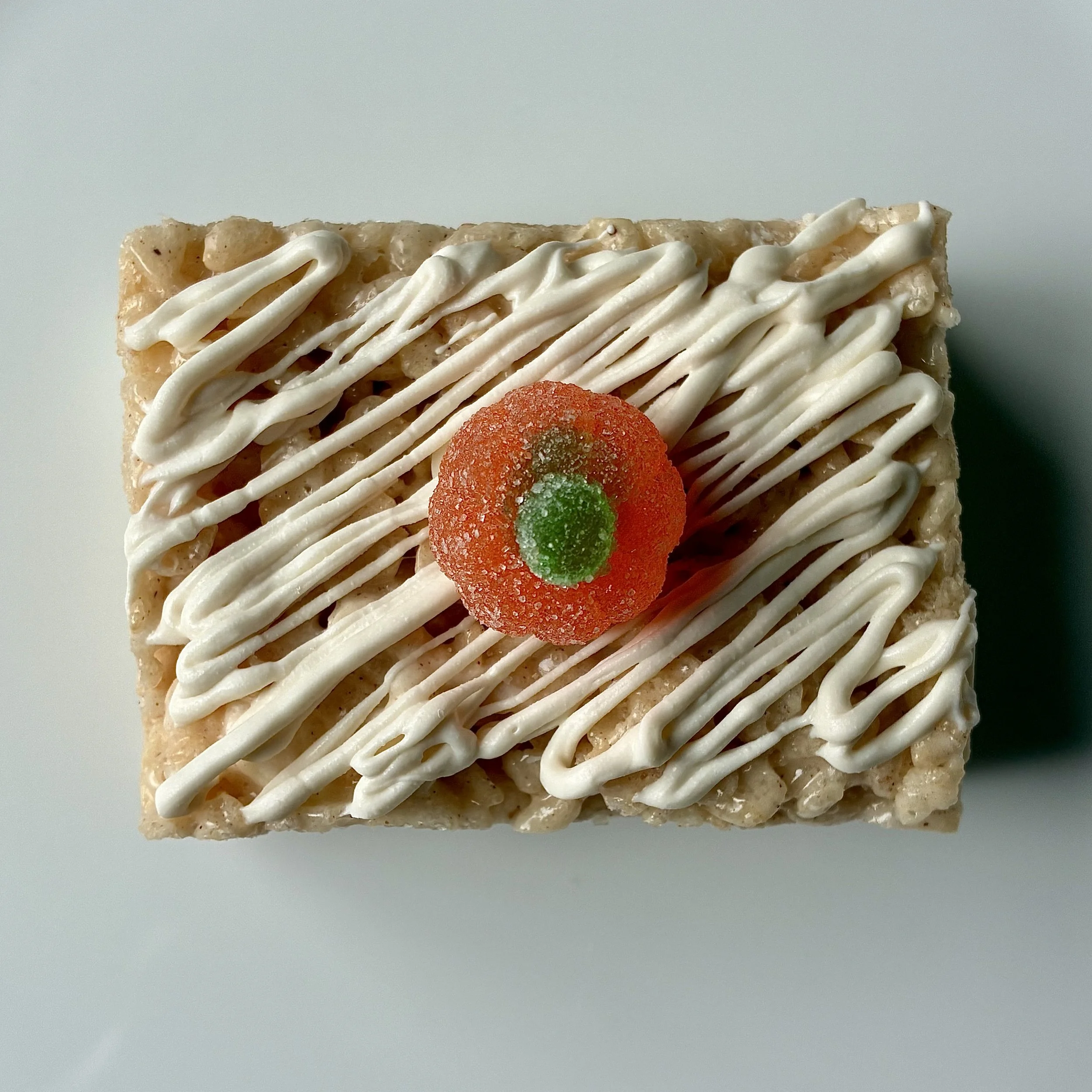 pumpkin spice flavored rice crispie treat base, roasted salted macadamia nut pieces, white chocolate chips, extra marshmallows, topped with a vanilla white chocolate drizzle and a jelly pumpkin candy