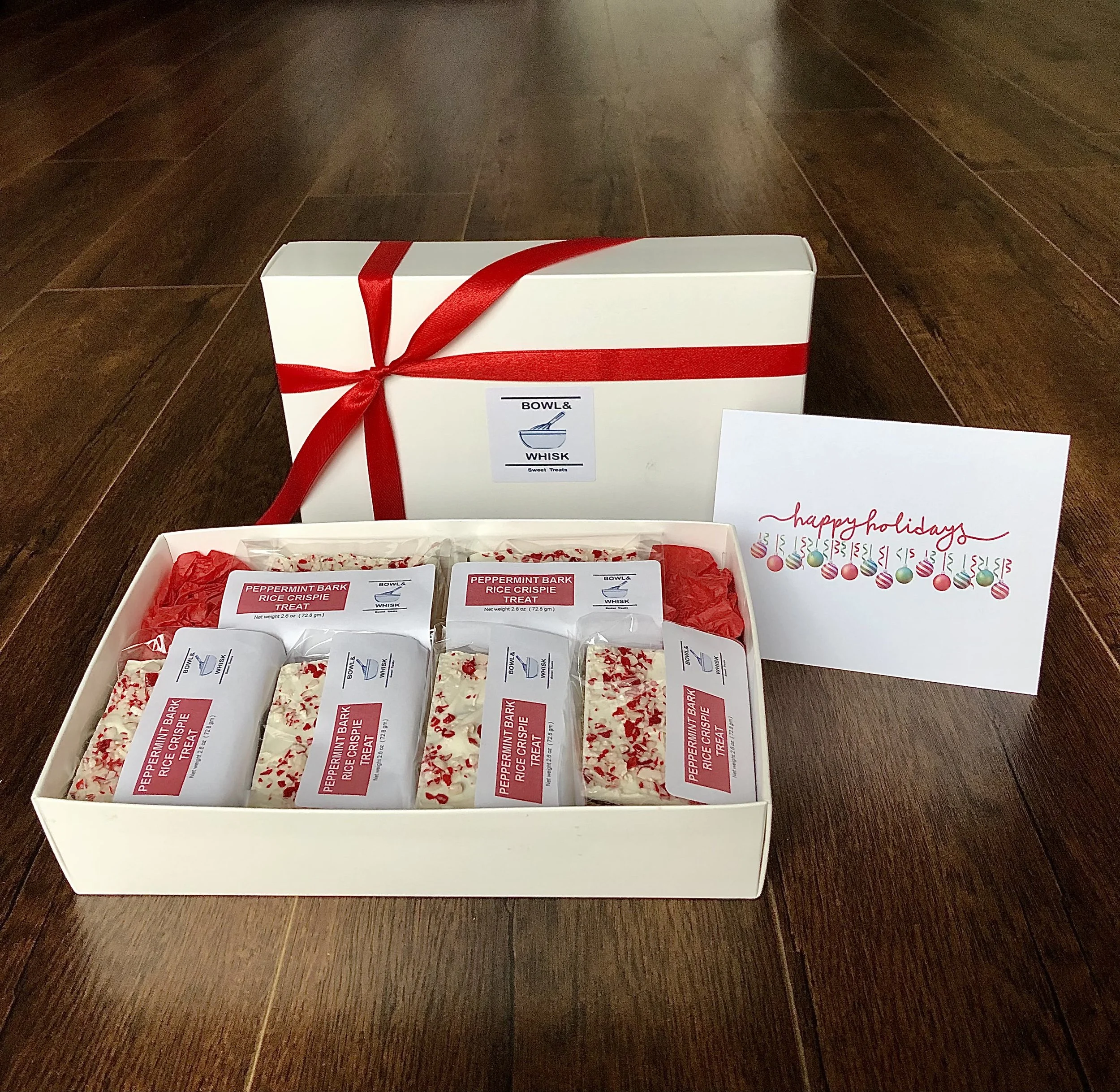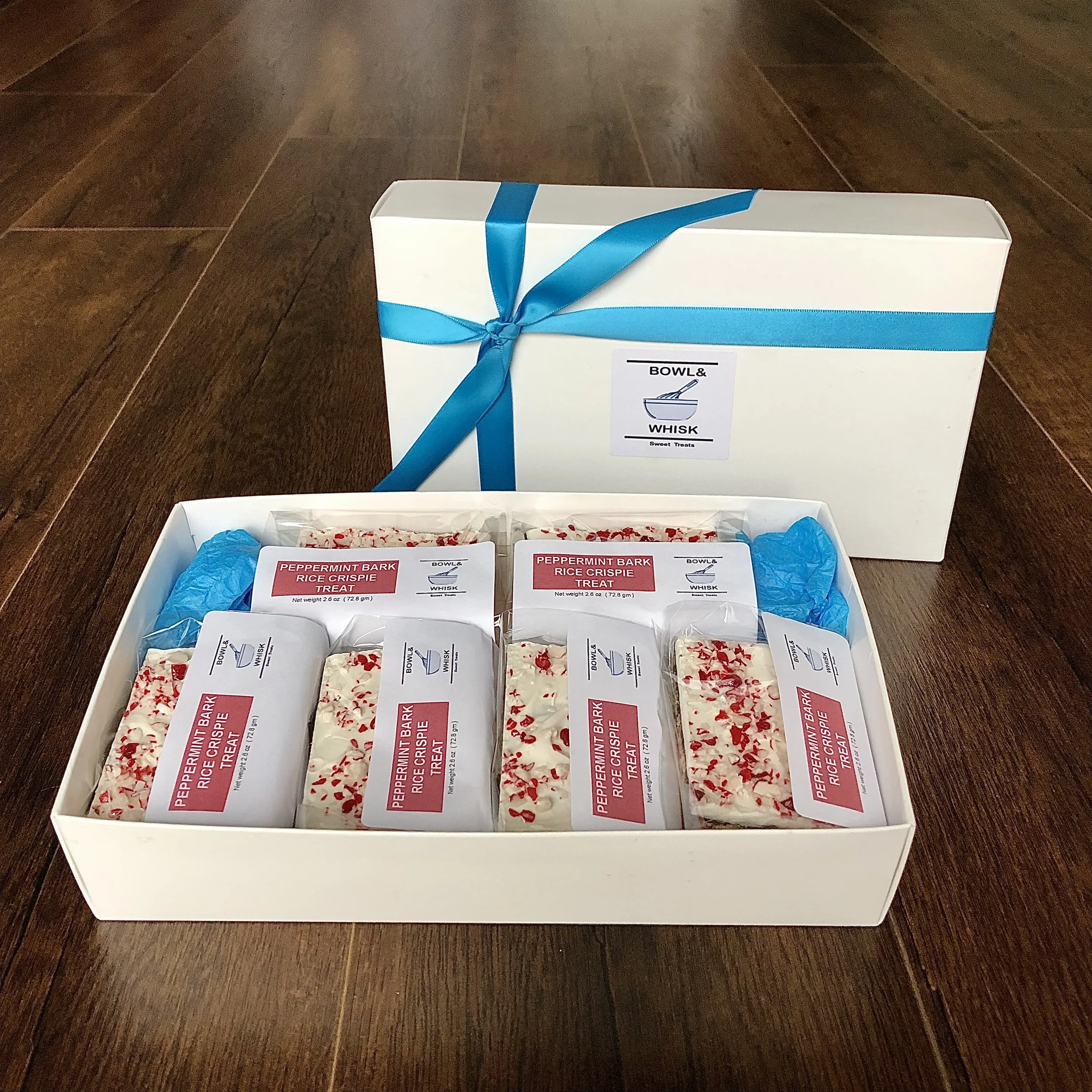 Each order contains 4 individually wrapped, custom-labeled crispie treats covered with turquoise-blue tissue paper or 6 individualy wrapped treats in a gift box with ribbon.